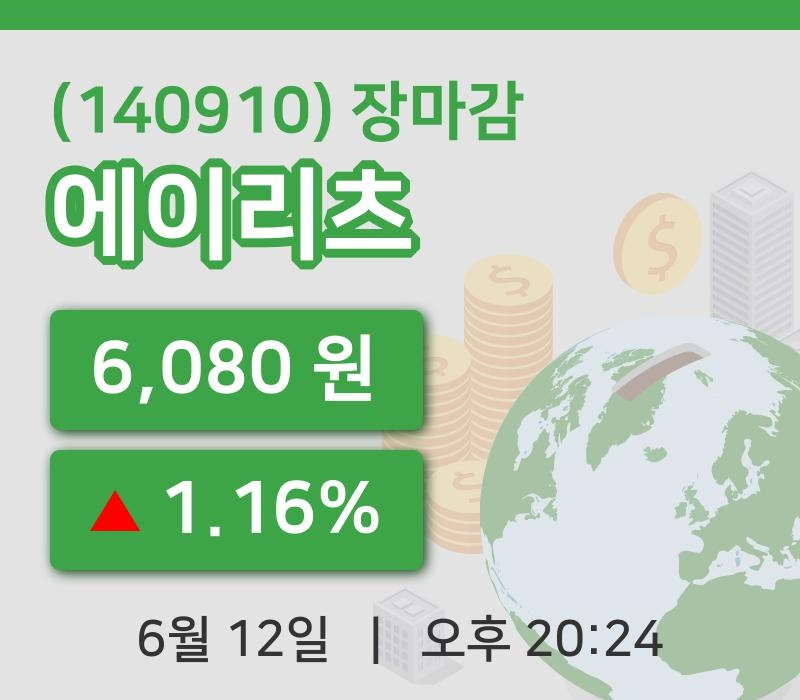▲6월 12일 에이리츠주가에이리츠의 시가총액은 223억원, 상장주식은 총 3,676,000주로 주당 액면가는 5,000원, 자본금은 184억원이다. 에이리츠의 영업일기준 지난 일...
